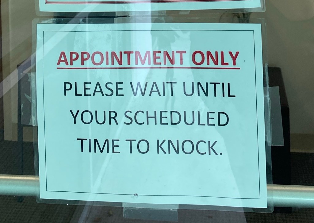 Recently I went to a medical supply store to pick up a new octopus (CPAP machine). I arrived 15 minutes early. For a military family that’s on time. Admittedly, I usually fail at this. I walked up to the door from my parking space, which was pretty far away. I found the usual collage of Covid signs all over the door. But one of them stuck out. Right in the middle was a sign that said, “Please wait until your appointment time to knock.“ 🤔 Ok.